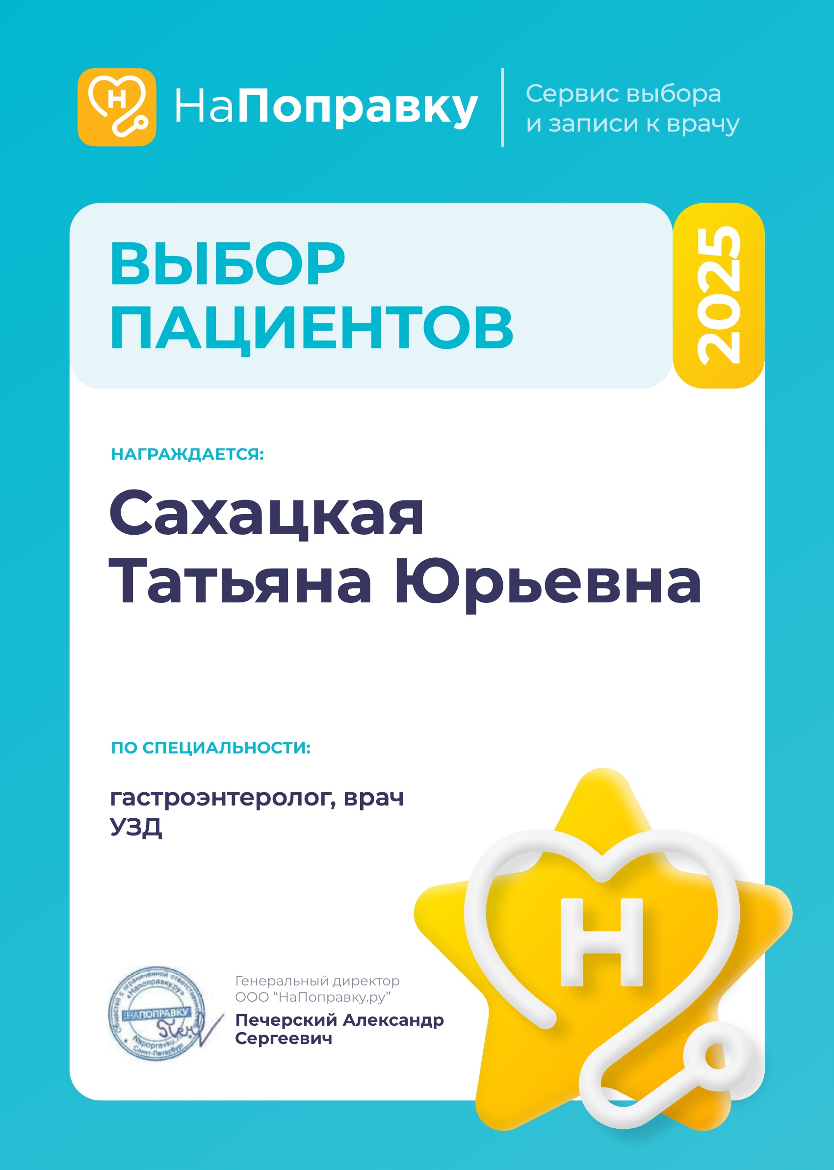 - гастроэнтеролог, врач УЗД САХАЦКАЯ ТАТЬЯНА ЮРЬЕВНА,